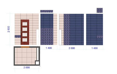 Plan of ceramic tiles for floors and walls and 3D visualization of the bathroom, kitchen, hallway and other rooms of the house.